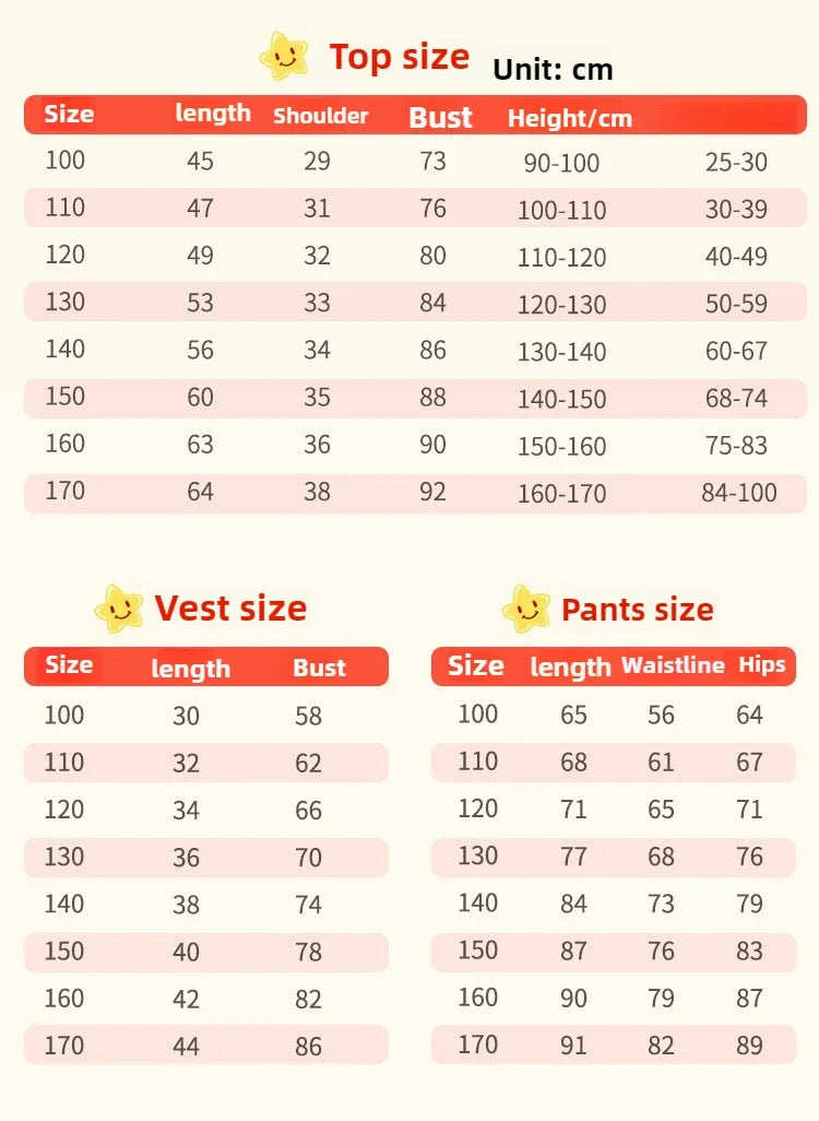 size_info: {"sizeInfoList":[{"length":{"cm":"100-105","inch":"39.37-41.34"},"size":"110cm","vid":-1},{"length":{"cm":"105-115","inch":"41.34-45.28"},"size":"120cm","vid":-2},{"length":{"cm":"115-125","inch":"45.28-49.21"},"size":"130cm","vid":-3},{"length":{"cm":"125-135","inch":"49.21-53.15"},"size":"140cm","vid":-4},{"length":{"cm":"135-145","inch":"53.15-57.09"},"size":"150cm","vid":-5},{"length":{"cm":"145-155","inch":"57.09-61.02"},"size":"160cm","vid":-6},{"length":{"cm":"155-165","inch":"61.02-64.96"},"size":"170cm","vid":-7}]}